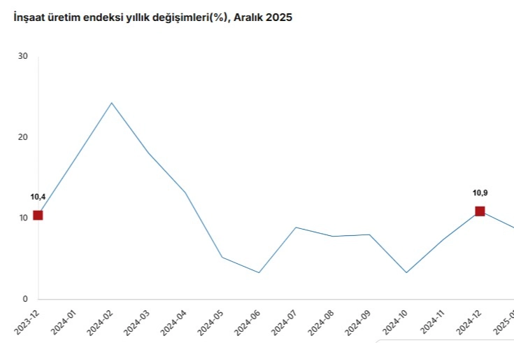 TÜİK, Aralık 2025 dönemine ilişkin inşaat üretim endeksi verilerini açıkladı. Buna göre; inşaat üretimi yıllık yüzde 7,5 arttı. İnşaatın alt sektörleri incelendiğinde, 2025 yılı Aralık ayında bina inşaatı sektörü endeksi bir önceki yılın aynı ayına göre yüzde 8,4, bina dışı yapıların inşaatı sektörü endeksi yüzde 5,8 ve özel inşaat faaliyetleri sektörü endeksi yüzde 5,5 arttı.İnşaat üretimi aylık ise yüzde 1 arttı. İnşaatın alt sektörleri incelendiğinde, 2025 yılı Aralık ayında bina inşaatı sektörü endeksi bir önceki aya göre yüzde 1,3, bina dışı yapıların inşaatı sektörü endeksi yüzde 0,9 arttı ve özel inşaat faaliyetleri sektörü endeksi yüzde 0,4 azaldı.