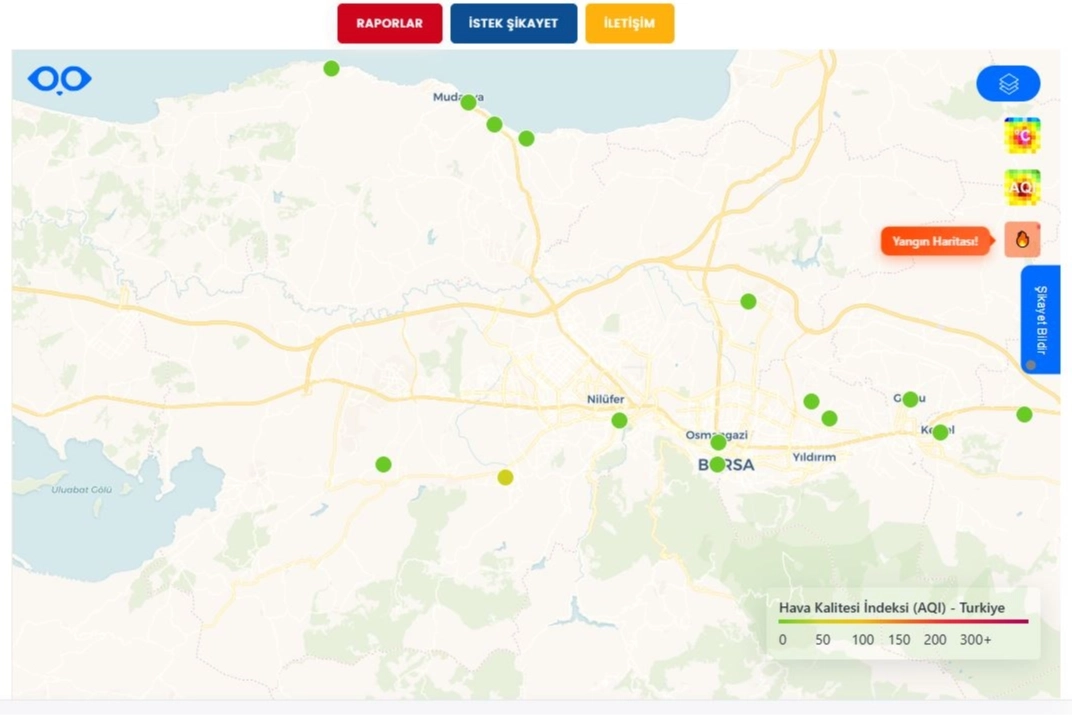 Bursa Büyükşehir Belediyesi, hava ve gürültü kirliliğinin tespiti için geçtiğimiz aylarda devreye aldığı hava kalitesi izleme sistemine yangın izleme sistemini de entegre etti. Bursa’daki ve Türkiye’deki tüm yangın noktalarını anlık olarak gösteren sistemi, Büyükşehir Belediyesi’nin internet sitesi üzerinden herkes kullanabilecek.