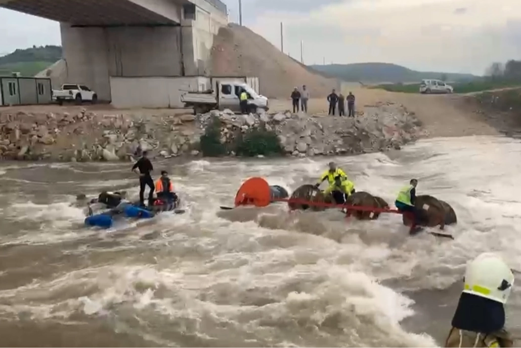 BURSA’nın Yenişehir ilçesindeki Kocasu Deresi’nden geçmeye çalışan, içinde elektrik işçilerinin bulunduğu traktör akıntıya kapılarak devrildi. Derede mahsur kalan 10 işçi, olay yerine gelen ekipler tarafından vinç yardımıyla kurtarıldı.