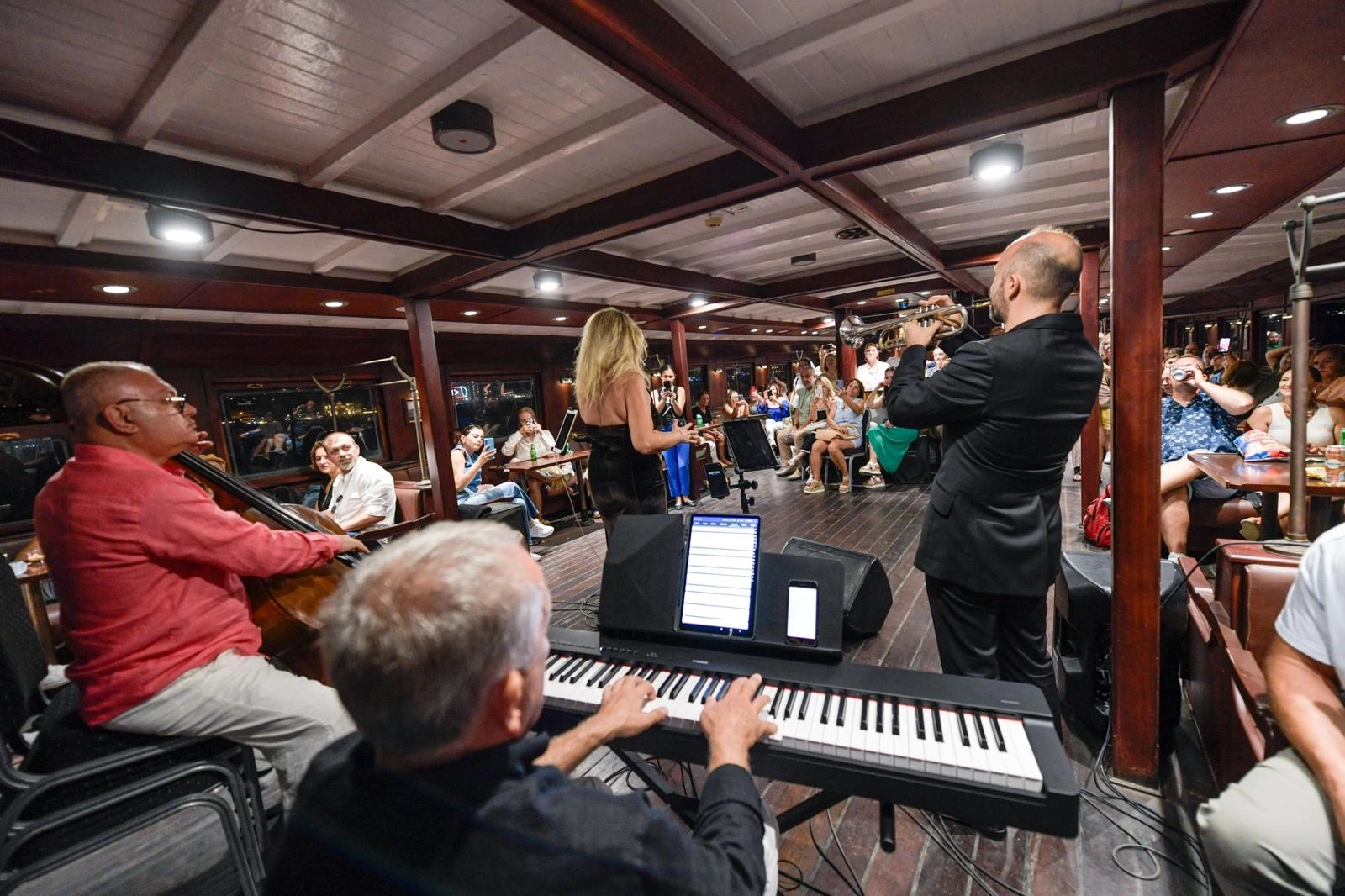İZMİR (İGFA) - Tarihi Bergama Vapuru, bu kez çok renkli ve coşkulu bir konsere ev sahipliği yaptı. Yerli ve yabancı çok sayıda sanatseverin katıldığı Caz Gecesi etkinliğinde Nükhet Yalçın Jazz Quartet’in melodileri yankılandı.